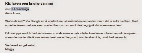 Gelukkig heb ik de Zeisterse Neonazi en Beroepsfantast Jan Peter Mante alias 'Maggy Magon' op tijd doorgehad en hem c.q. haar dit ook laten weten. Vervolgens kwam hierop de volgende reactie van Mante alias 'Maggy Magon' terug.
