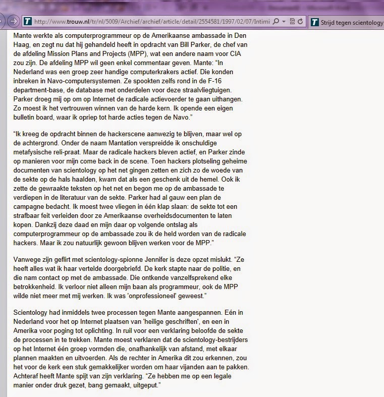 Zoals een aantal van u ongetwijfeld nog weet, heeft de Zeisterse Neonazi en oplichter Jan Peter Mante in het verleden getracht de Scientology Church in Amsterdam op te lichten en te chanteren. U ziet dit hele verhaal uitvoerig vermeld staan in de artikelen in Trouw hieronder. Inmiddels heb ik persoonlijk telefonisch contact gehad met de beide journalisten, die de Zeisterse Neonazi Jan Peter Mante in het verleden hebben geïnterviewd. Dit zijn de journalisten Romana Abels en Koert van der Velde van het dagblad Trouw. Over de journalistieke waarheidsgetrouwheid van de gepubliceerde artikelen in Trouw heeft Romana Abels naar mij toe de volgende schriftelijke verklaring afgelegd: