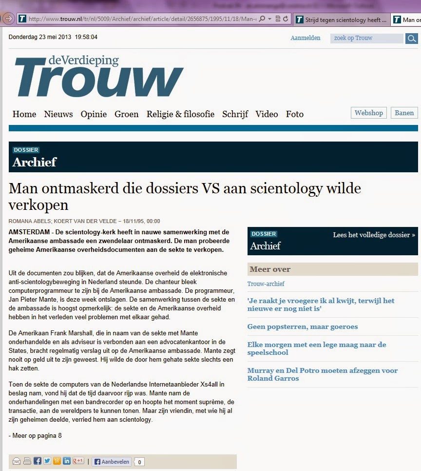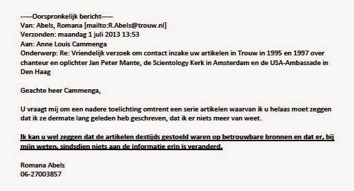 Zoals een aantal van u ongetwijfeld nog weet, heeft de Zeisterse Neonazi en oplichter Jan Peter Mante in het verleden getracht de Scientology Church in Amsterdam op te lichten en te chanteren. U ziet dit hele verhaal uitvoerig vermeld staan in de artikelen in Trouw hieronder. Inmiddels heb ik persoonlijk telefonisch contact gehad met de beide journalisten, die de Zeisterse Neonazi Jan Peter Mante in het verleden hebben geïnterviewd. Dit zijn de journalisten Romana Abels en Koert van der Velde van het dagblad Trouw. Over de journalistieke waarheidsgetrouwheid van de gepubliceerde artikelen in Trouw heeft Romana Abels naar mij toe de volgende schriftelijke verklaring afgelegd: